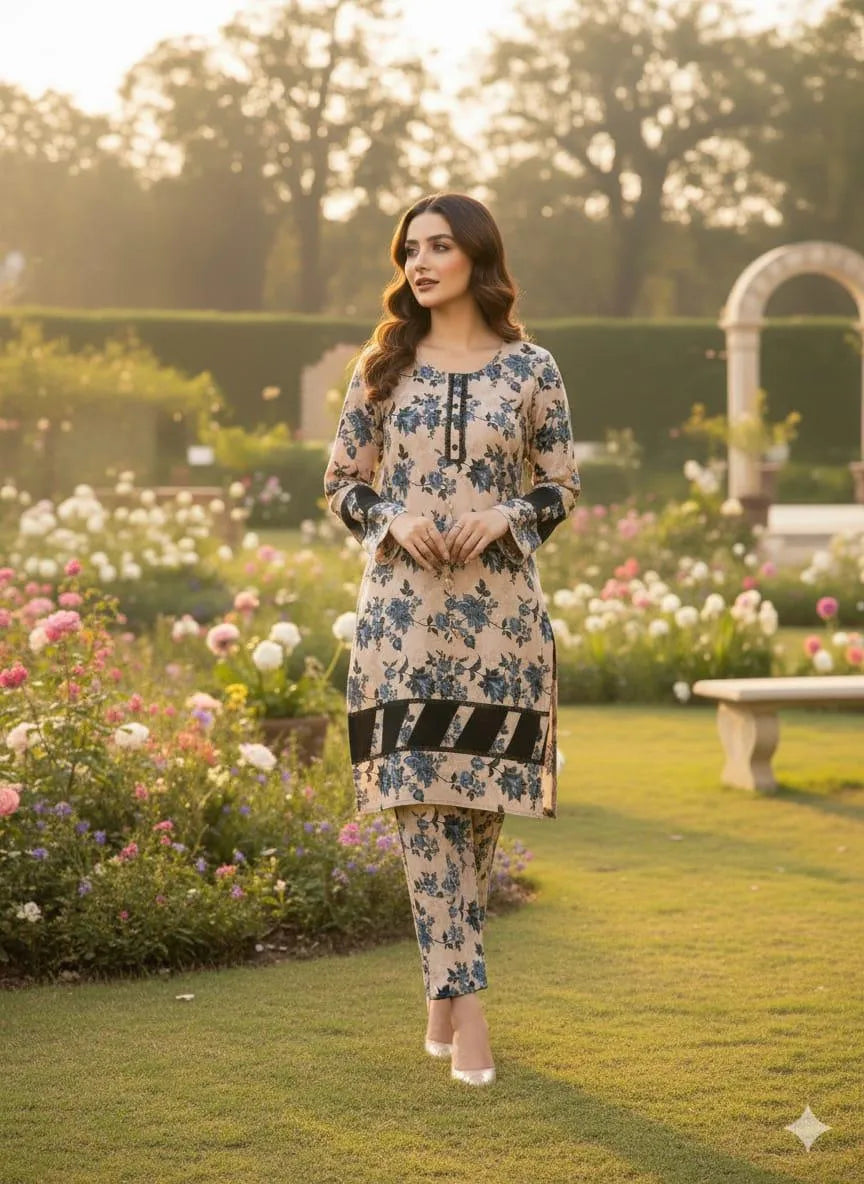 Stylish Women's Stitched Printed Shirt and Trouser Set - 2 Pcs in Crystal Wool and Cotton